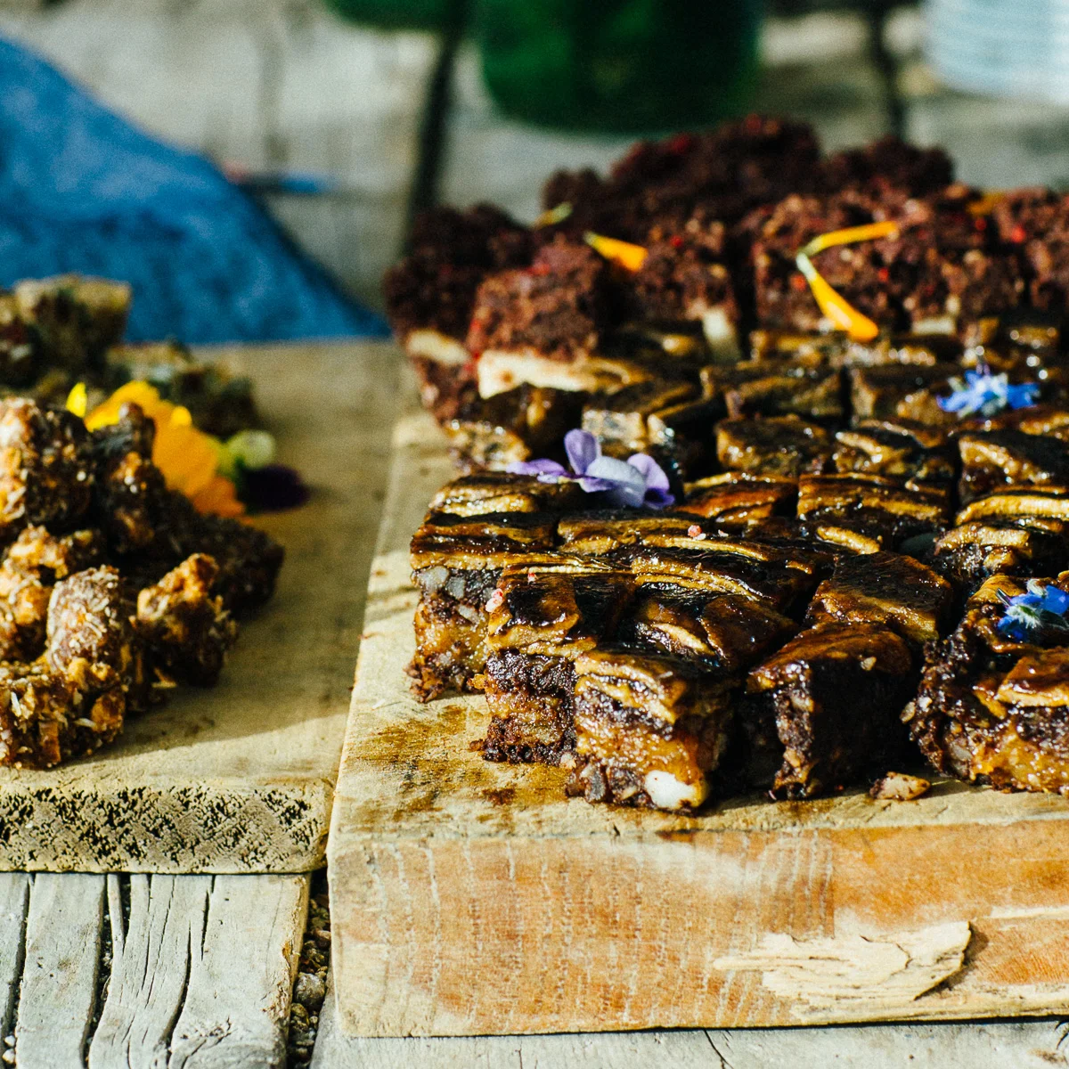 Meg and little bird organic's raw caramel & banana brownie, and apricot logs.